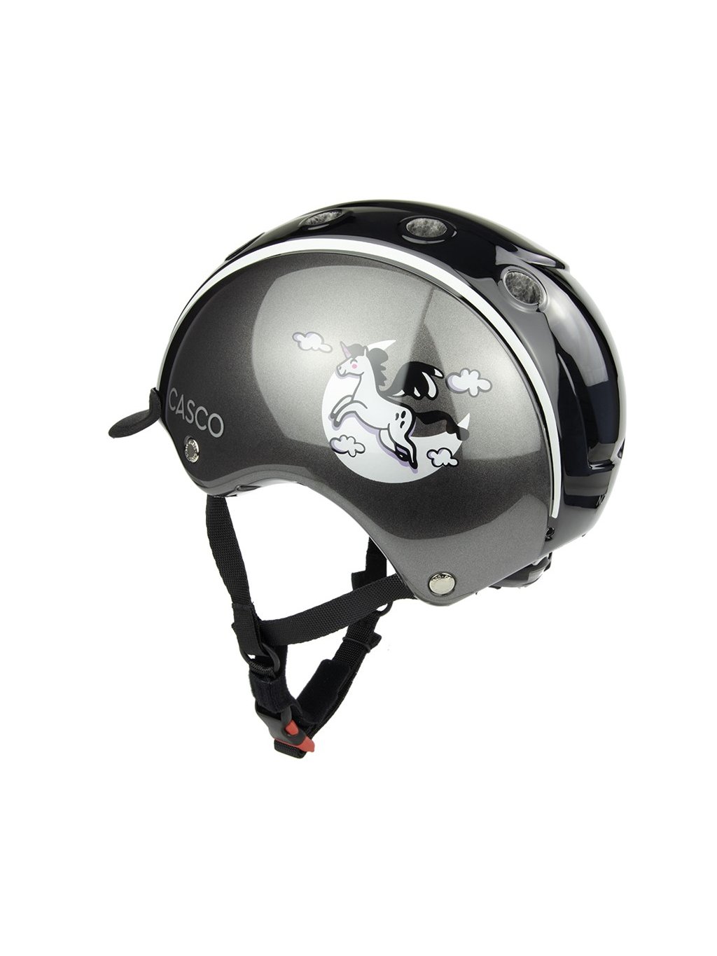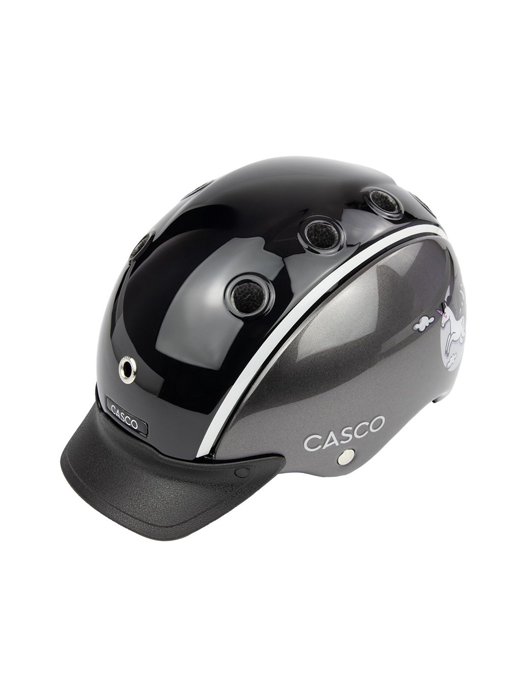 Jeden z nejoblíbenějších modelů dětských jezdeckých helem Casco Nori v šedo-černé barvě s potiskem jednorožce v zadní části.